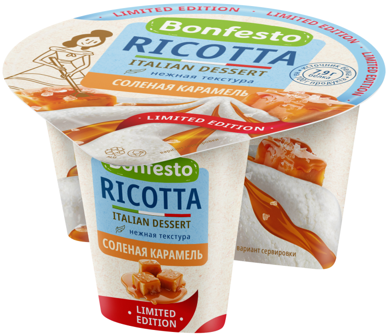 Бренд Bonfesto выпустил лимитированную коллекцию рикотта с новым вкусом "Солёная карамель". Продукт выпущен ограниченным тиражом.
