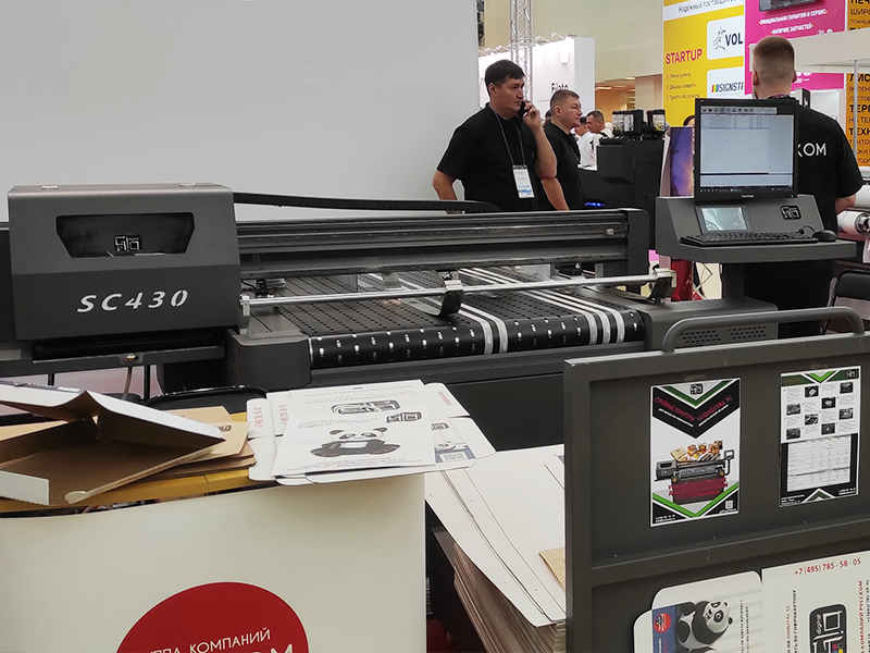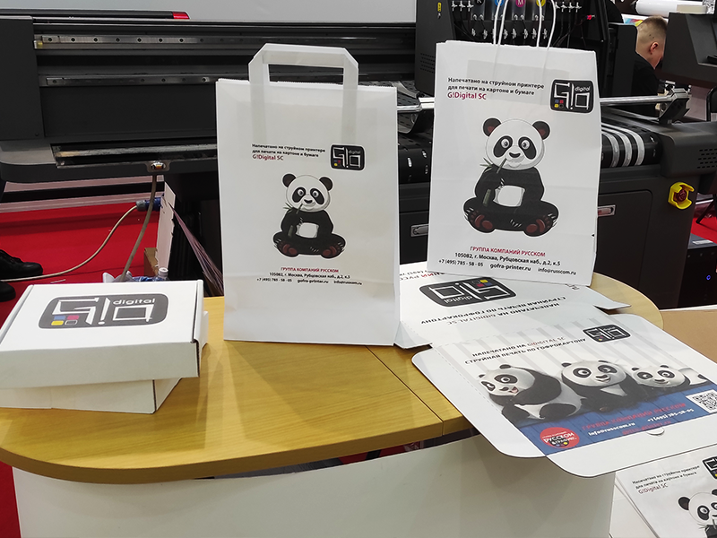 Прямо на стенде ГК «РУКССКОМ» можно было увидеть процесс изготовления упаковки по требованию: печать по гофрокартону на принтере G!Digital SC430 и резка под необходимый формат и форму на плоттере MasterCutter 1070 GT, а также получить образцы печати на бумажном крафт-пакете, коробках для пиццы, дойпаках и т.д.