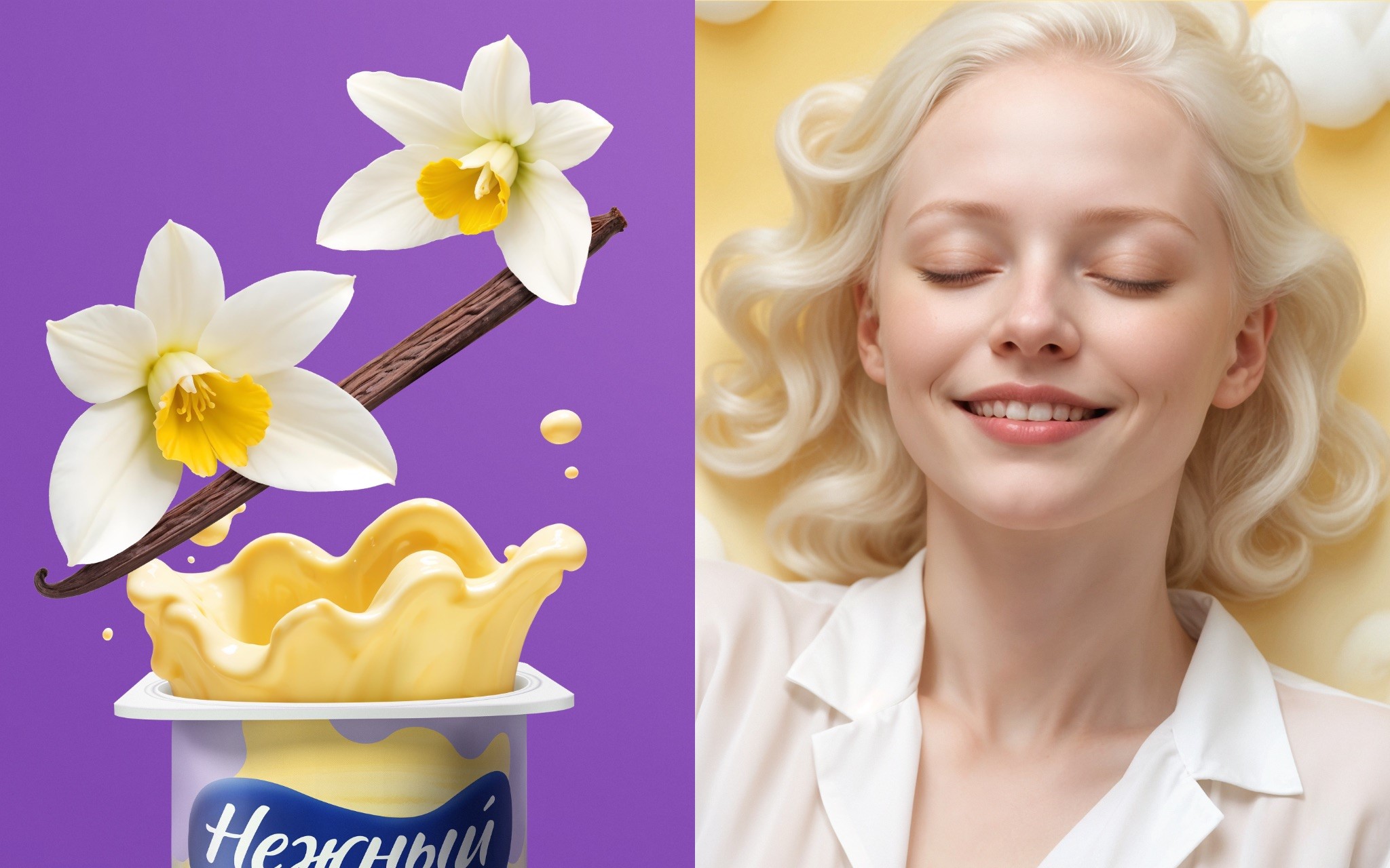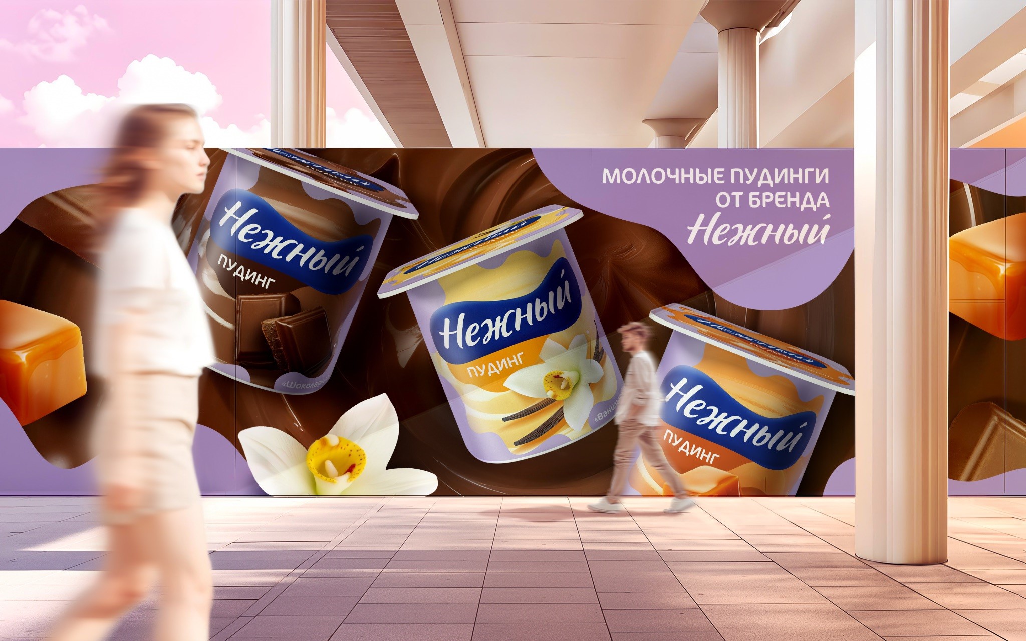 Текстуры пудинга, аппетитные изображения шоколада, карамели и ванили дополняют нежные, фиолетовые оттенки фона, создавая атмосферу легкости и удовольствия. Такой подход усиливает восприятие продукта как десерта для небольшого ежедневного наслаждения, что важно для продвижения в консервативной категории.