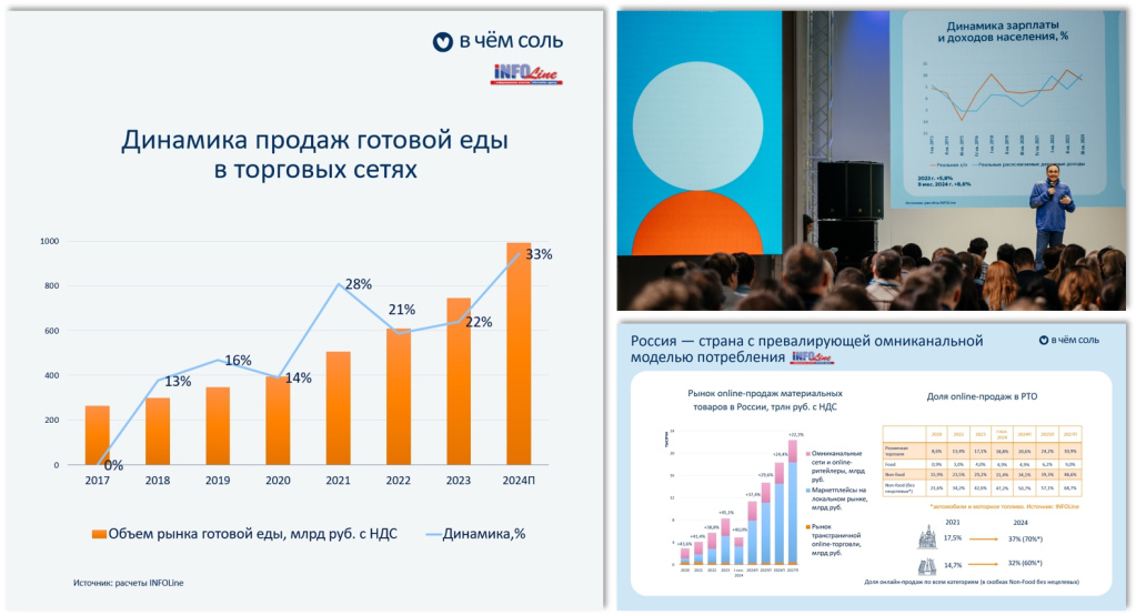 Ретейлеры увеличат продажи готовой еды в 2024 году на 33% до 990 млрд руб., заявил генеральный директор «INFOLine-Аналитики» Михаил Бурмистров в ходе первой конференции «Яндекс Лавки» для поставщиков, а также производителей готовой еды и собственных торговых марок. Если бы не дефицит производственных мощностей, то рынок мог бы вырасти 1,05 трлн руб., уверен эксперт.