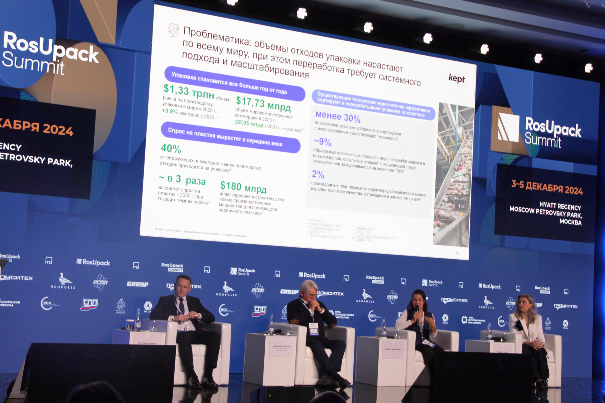 В Москве 3-5 декабря состоялось деловое бизнес-мероприятие RosUpack Summit, устроенное компанией ITE, организатором крупнейшей в России и СНГ выставки упаковки RosUpack, при поддержке Российского союза промышленников и предпринимателей. На аналитической пленарной сессии «Упаковка 360» 4 декабря выступила Далия Сафиуллина, руководитель бизнес-направления по переходу к экономике замкнутого цикла KEPT с докладом «Новая реальность в развитии упаковки: глобальные тренды, международный опыт и перспективные для России циклические практики».