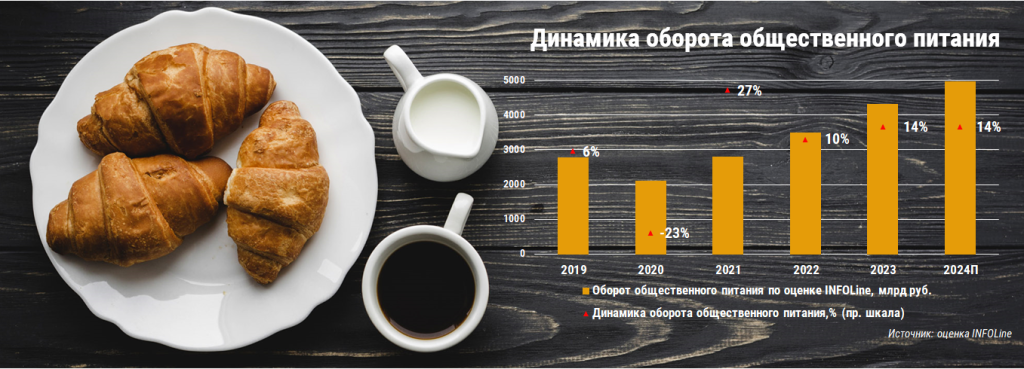 По предварительной оценке INFOLine, оборот предприятий общественного питания в России 2024 г. вырастет на 13 - 14% (в сопоставимых ценах) и составит около 5 трлн рублей.