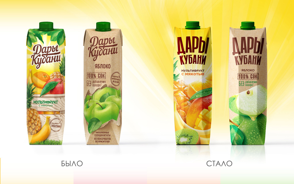 Агентство Getbrand разработало новый дизайн упаковки для сокового бренде "Дары Кубани". Дизайнеры придерживались стратегии преемственности, чтобы сохранить узнаваемость бренда и не отпугнуть существующих потребителей. В агентстве бережно относились к наследию бренда, добавляя лишь необходимые улучшения, чтобы сделать его более современным и привлекательным.