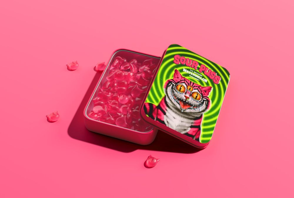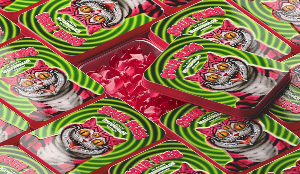 В агентстве придумали героя, Кислую Кису (Sour Puss), - слегка гротескного персонажа. Он демонстрирует: эти сладости настолько кислые, что перенесут вас в другое измерение. На упаковке изображён испуганный кот с поднятой дыбом шерстью, а сами арбузные конфеты выполнены в форме странных кошачьих глаз с ушками. Всё вместе оформлено как постер в стиле панк-рок. Яркие цвета и вызывающий шрифт бросают вызов правилам упаковки товаров повседневного спроса. Премиальная жестяная коробка украшена 3D-тиснением, благодаря которому киса выглядит живой.