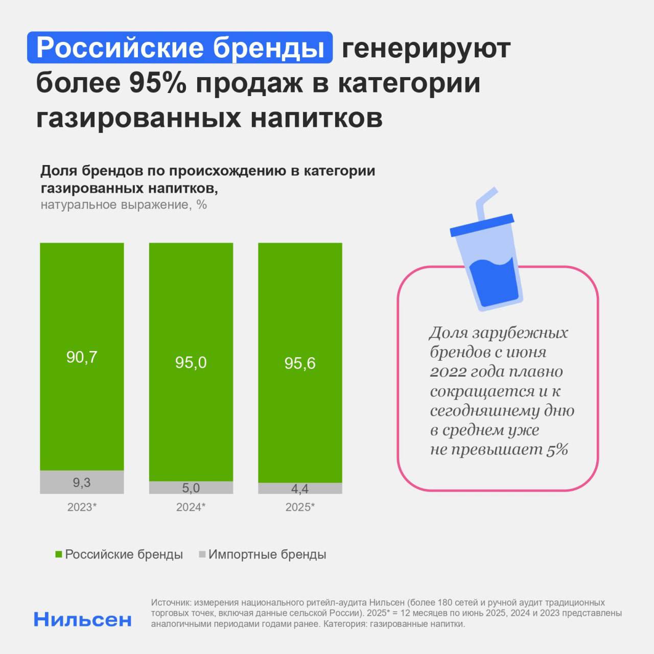Российские марки газированных напитков продолжают уверенно усиливать свои позиции на рынке: в текущем периоде за двенадцать месяцев по июнь 2025 года на них пришлось 95,6% продаж категории в натуральном выражении. Для сравнения: в 2023 году этот показатель составлял 90,7%.