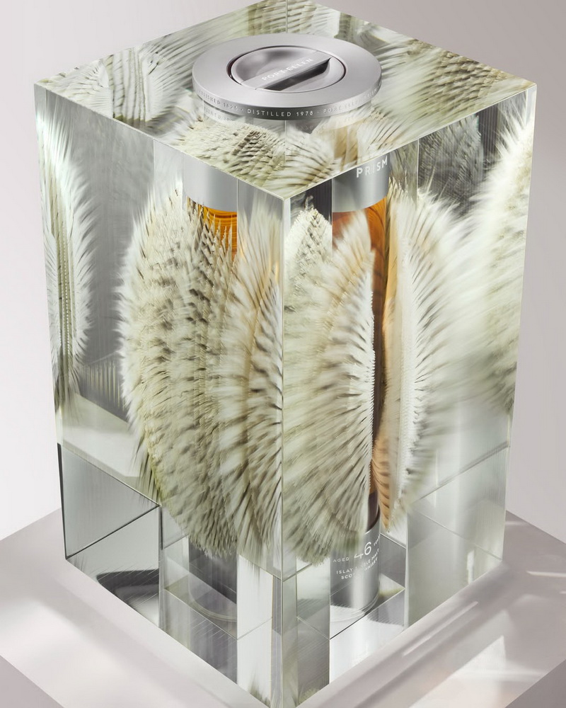 Эта иллюзия плавающих многомерных форм ассоциируется с дымом, вкусовой характеристикой, лежащей в основе виски Port Ellen Prism.