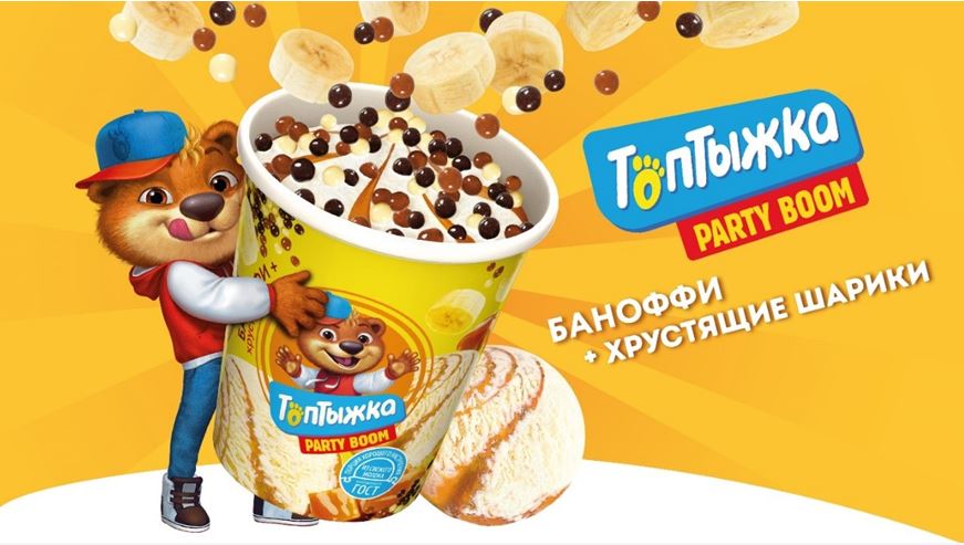 Новинка отличается сочетанием ингредиентов: классическое ванильное мороженое «Топтыжка» дополнено насыщенным карамельно-банановым топингом «баноффи» и декорировано хрустящими воздушными шариками в натуральном шоколаде.