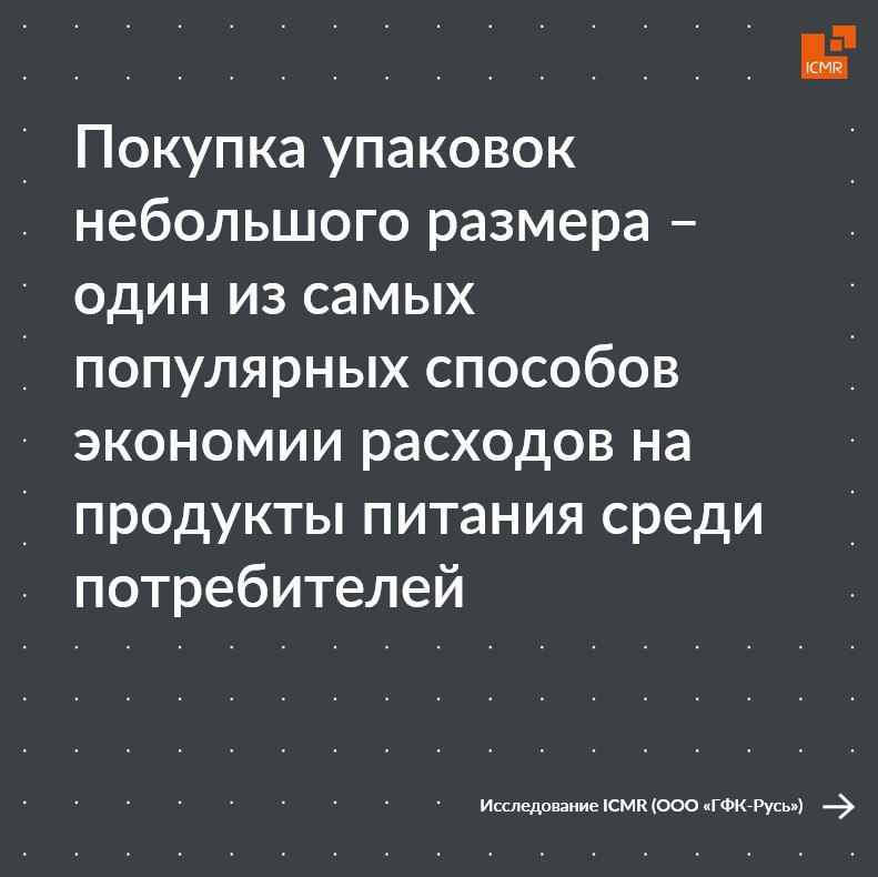 По данным исследования «ГФК-Русь» ICMR Shopper Trends, покупка упаковок небольшого размера – один из самых популярных способов экономии расходов на продукты питания среди потребителей.