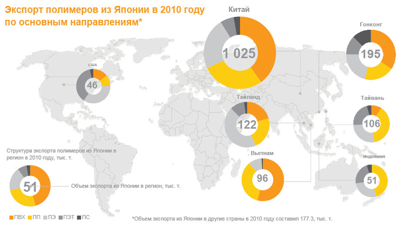 Вторым по масштабам является ПВХ. Поливинилхлорид – это один основных полимеров в структуре экспорта Японии. В 2010 объем экспорта ПВХ из Японии составил около 680 тыс. т. Остановка отдельных мощностей по производству ПВХ уже привела к существенному росту цен на азиатскую и североамериканскую смолу.