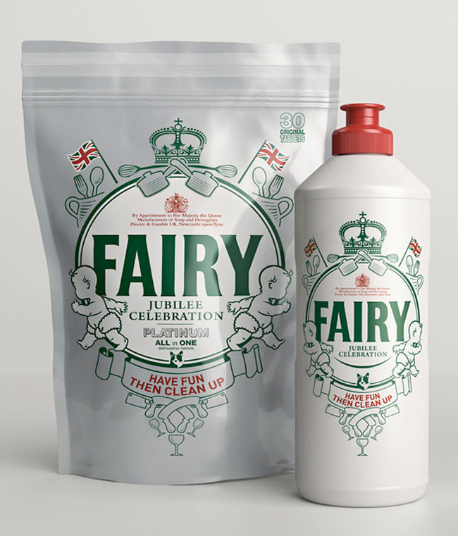 В честь бриллиантового юбилея правления королевы Елизаветы II, который Великобритания отмечала в 2012 году, компания Procter and Gamble выпустила ограниченную серию своего популярного моющего средства Fairy.