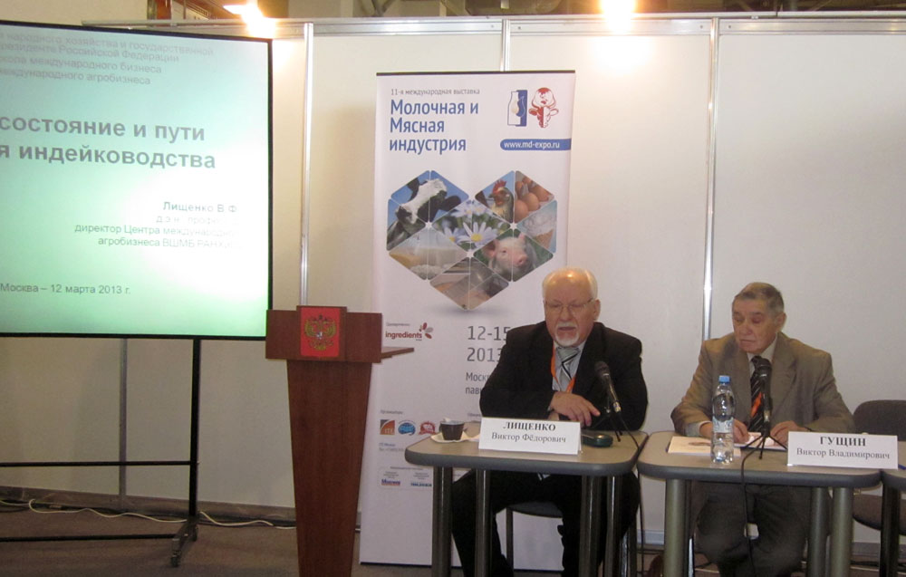 В рамках открывшейся в Москве международной выставки «Молочная и мясная индустрия 2013» 12 марта 2013 г. прошла конференция на тему «Индейководство в России – будущее за качественным продуктом». Как известно, мясо индейки обладает многими полезными свойствами, и развитие этой отрасли птицеводства имеет большое значение для нашей страны. Выступая с основным докладом на конференции, Виктор Лищенко, профессор, директор Центра международного агробизнеса ВШМБ РАНХ и ГС, рассказал о путях развития индейководства в Росссии.