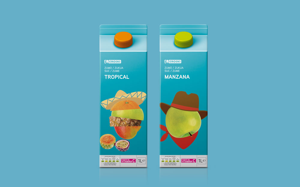 Испанская студия Supperstuodio разработала яркий и веселый дизайн упаковки для соков Eroski. Главная роль в дизайне отведена фрукту – основному ингредиенту в составе сока.