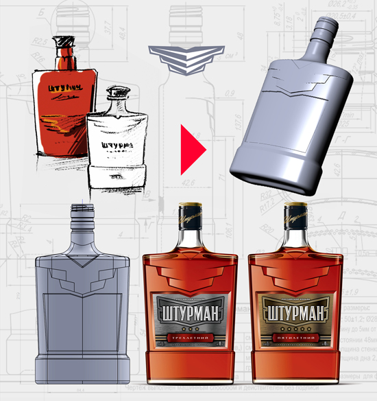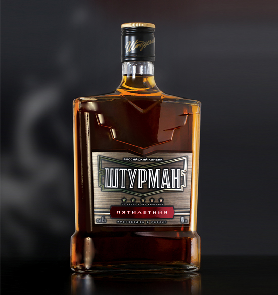 Основным узнаваемым декоративным элементом лицевой стороны фляги стал знак бренда в виде военной эмблемы из стилизованных крыльев, при этом на обороте бутылки выгравировано рукописное исполнение названия бренда "Штурман". Логотип бренда помещен в закрытую коммуникацию в виде стилизованного шеврона. Использование металлизированных шероховатых объемных элементов в дизайне этикетки усиливает подчеркнуто мужской характер нового бренда. Проект выполнен по заказу "Настоящей Алкогольной Компании".