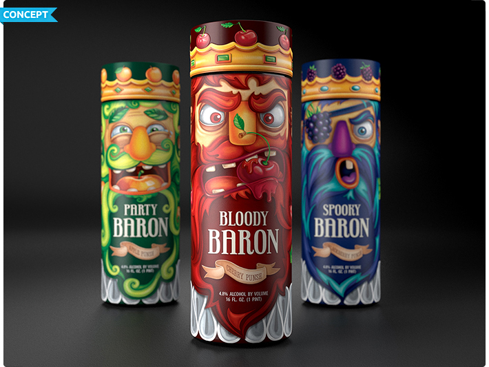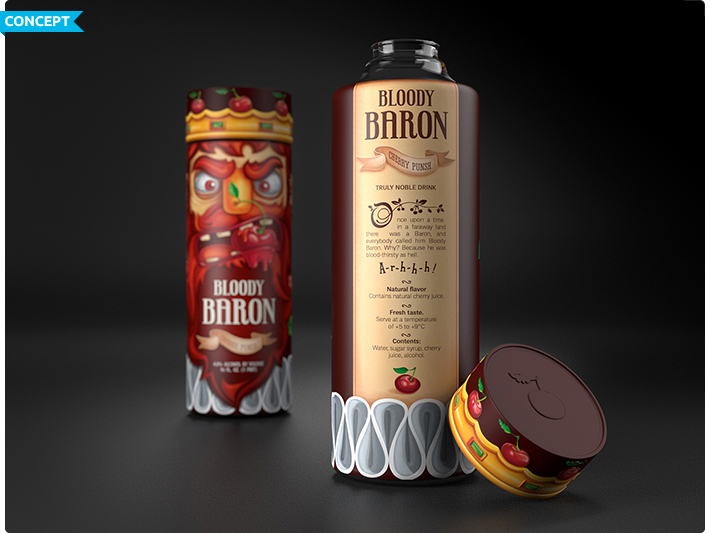 "Выбирая в магазине алкогольные напитки, многие начинают вести себя, как знатоки. «Оттенок печеного яблока», «аромат сливы и дыма», «нотки розы и абрикоса», «бархатистый вкус»… И также часто бывает достаточно одного лишь глотка, чтобы все это ушло на задний план и люди просто наслаждались хорошими напитками и компанией. Идея упаковки для серии фруктово-ягодных пуншей «Party Baron» является воплощением этого явления. Все высокомерие исчезает, когда открывается крышка — «барон раскоронован» и счастлив! И потому он — «барон» вечеринки", - описали свою новую работу в студии.