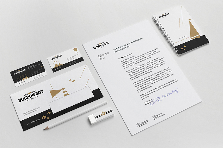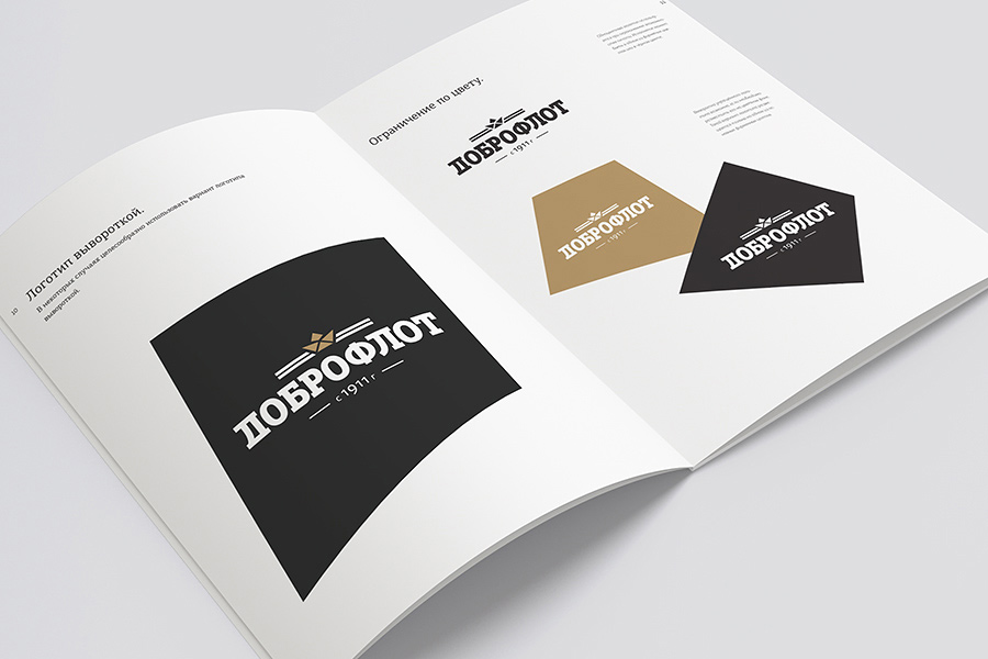 В основу фирменного стиля «Доброфлота» легли лаконичные геометрические формы. Логотип и стилизованные графические элементы перекликаются с конструктивизмом 1920-30-х годов. Спокойные основные цвета дополняются яркими второстепенными — именно они призваны срифмовать фирменный стиль с находящейся в разработке упаковкой для премиальной линейки рыбных консервов.