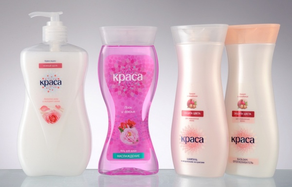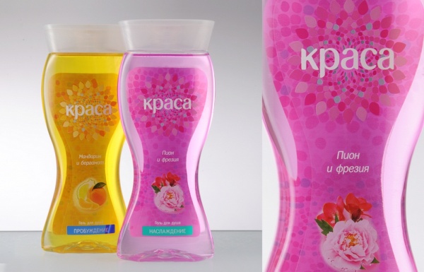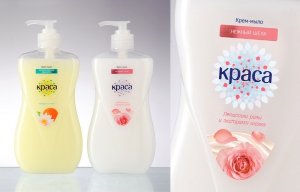Оформление флаконов с мылом «Краса» основано на укрупнённых деталях, так как подобный продукт не имеет функциональных особенностей и не требует акцента на информационной составляющей.