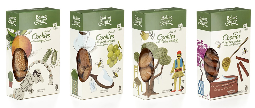 Разные «истории» основаны на рецептах, в которых используются традиционные греческие продукты: томаты, оливки, фета, тимьяновый мед, мастика Хиос. Название “Baking stories” (пер.: рассказы о выпечке) органично вплетается в общую идею. Иллюстрации также следуют теме «моменты из жизни Греции»: кофе с печеньем, узо и мезе, персонажи театра теней Karagiozis.