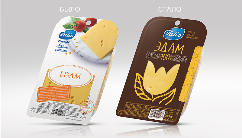 Бренд обрел индивидуальность благодаря цветовым решениям и оригинальными формами вырубки "окон", для которых были использованы понятные потребителю и рождающие европейские ассоциации символы: например, ветряная мельница для голландского маасдама или альпийский цветок для тильзита.