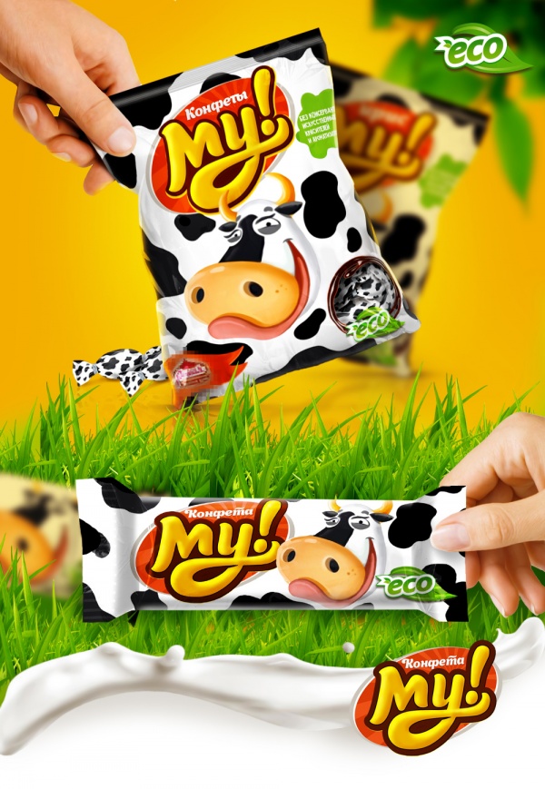 Гомельская креативная команда "Концепт" разработала дизайн упаковки для молочных конфет "Му!". Задача состояла в том, чтобы подчеркнуть натуральность и показать связь с молоком.