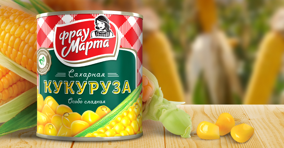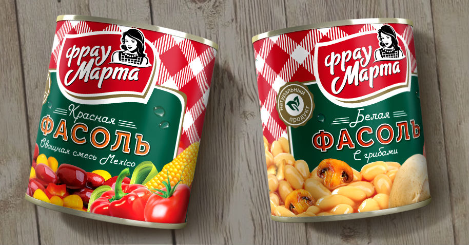 В ретро-визуализации продукты ТМ «Фрау Марта» - из хорошего прошлого. Фирменная красно-белая клетка выделяет бренд на полке, аппетитное, фотографическое изображение содержимого упаковки подчеркивает его вкус и натуральность, вызывающие доверие конечного потребителя. Для того, чтобы выделить сочность консервов в дизайн были добавлены «влажные» зоны.