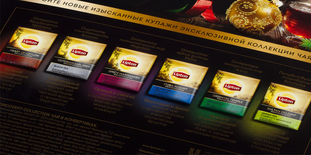 Discovery Collection — премиальная линейка чая Lipton, состоящая из сортов чая, собранных в разных странах. Шесть изысканных купажей и благородные сочетания ароматов погружают в атмосферу увлекательного путешествия по чайным плантациям всего мира.