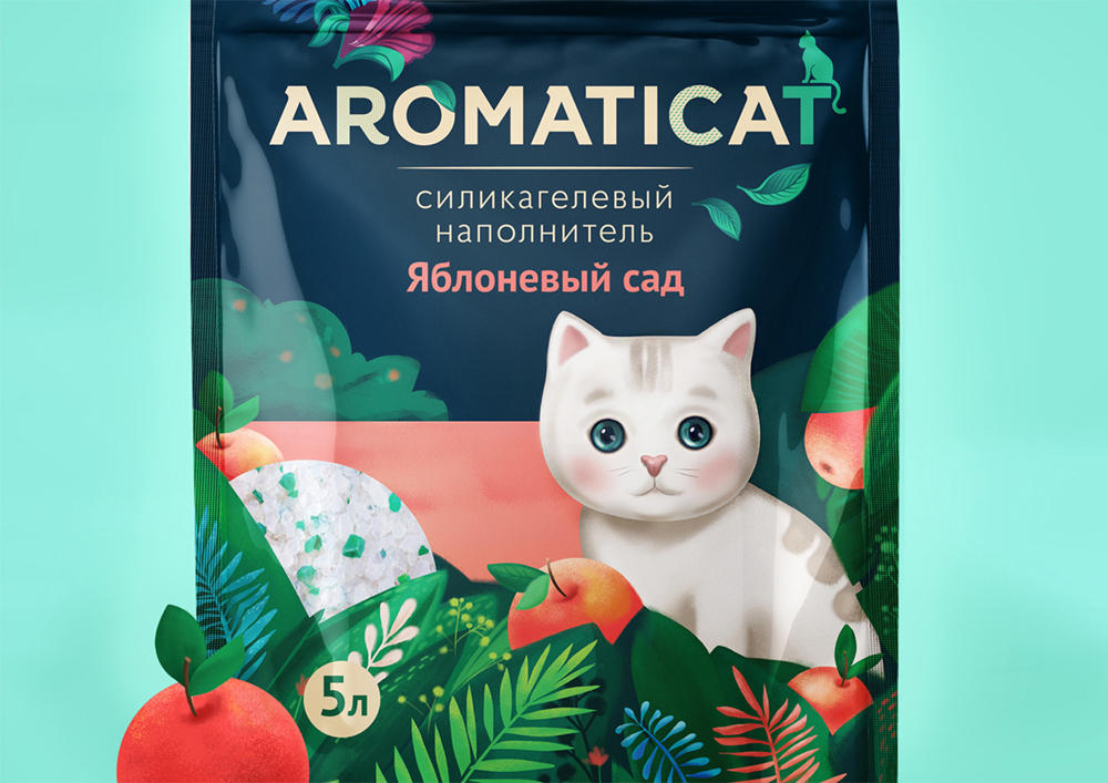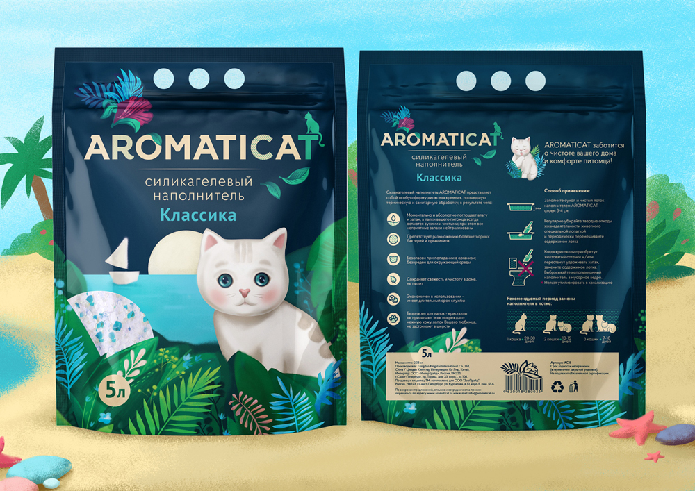 Агентство "Дочери" (Санкт-Петербург) разработало дизайн упаковки для силикагелевого наполнителя кошачьего туалета Aromaticat. Заказчик - петербургская компания ЗооПрайд.