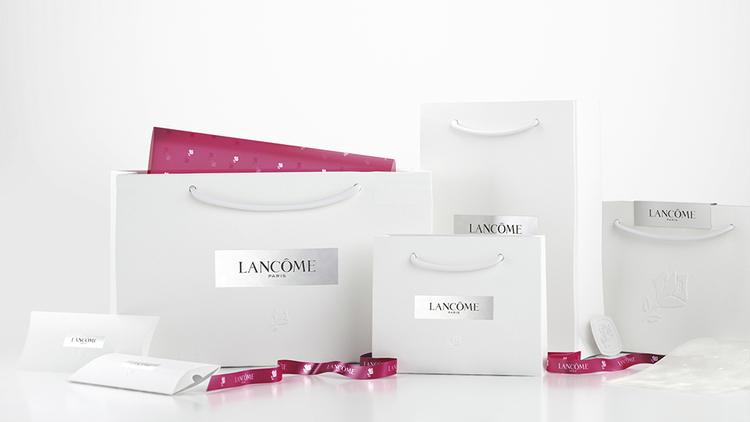 Чистый белый цвет хлопковой бумаги делает образ простым, но изысканным. Бренд не кричит о себе, он спокойно заявляет: «Я – Lancôme». Среди немногочисленных элементов дизайна – плашка из серебряной фольги. Отражая свет, она акцентирует внимание на логотипе бренда. Вторым элементом стала бессменная роза, выполненная блинтовым тиснением.
