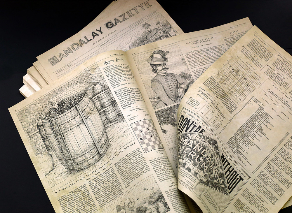 Бутылка рома завернута в копию «Газеты Мандалая». Это пародия на ранние колониальные газеты, которые рассказывали городские новости.