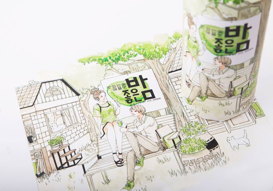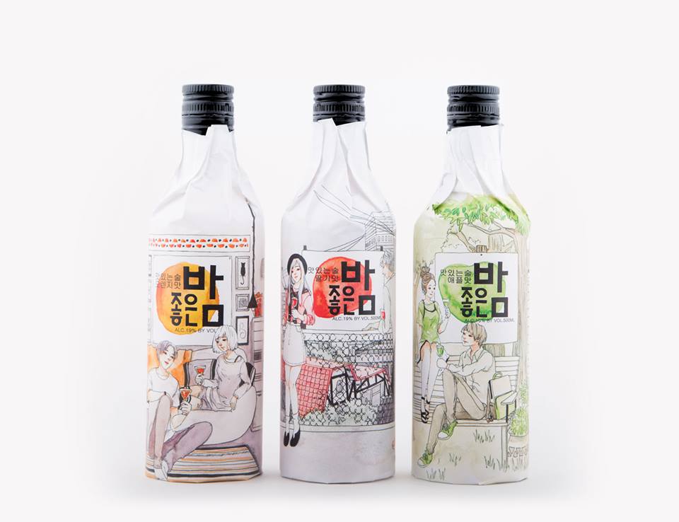 Название переводится с корейского как "Приятный вечер", этот продукт как раз создан для такого вечера в хорошей компании. Опорная точка в коммуникации с потребителем — иллюстрация на бумажном пакете, выполненные в акварели. Каждая построена на преобладании цвета, характерного для конкретного вкуса.