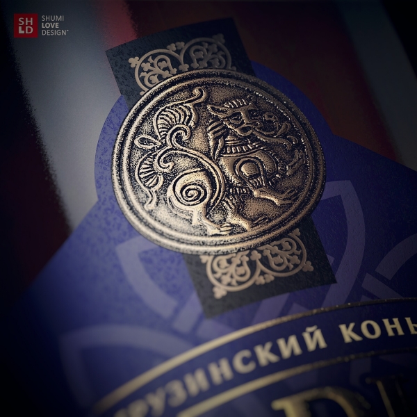 Созданное агентством решение можно охарактеризовать как информативное, традиционное, и в то же время современное. Главными визуальными элементами композиции выступают название продукта и логотип торговой марки, выполненные при помощи тиснения золотой фольгой, что создаёт иллюзию традиционной грузинской чеканки по золоту. Так же золотом выделен срок выдержки коньяка и дополнительные информационные блоки, которые стилизованы для усиления эффекта чеканки. Общую же композицию объединяет фоновое изображение, стилизованное под традиционный национальный орнамент, которое ещё громче заявляет о географической принадлежности коньяка, при этом выглядит достаточно современно и оригинально.