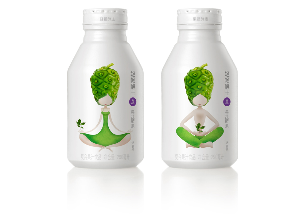 Целевой покупатель новинки - это молодые люди с хорошим заработком, имеющие представление о преимуществах энзимов, заботящиеся о своем здоровье и питании. «Наш заказчик определил новый продукт как «питьевая йога». Основным элементом дизайна стала простая, не перегруженная деталями иллюстрация человека-фрукта. Плавные линии и естественные цвета создают безмятежный, гармоничный образ. Иллюстрация также определяет вкусовую характеристику напитка: нони и бузина/роза, гранат и черника.