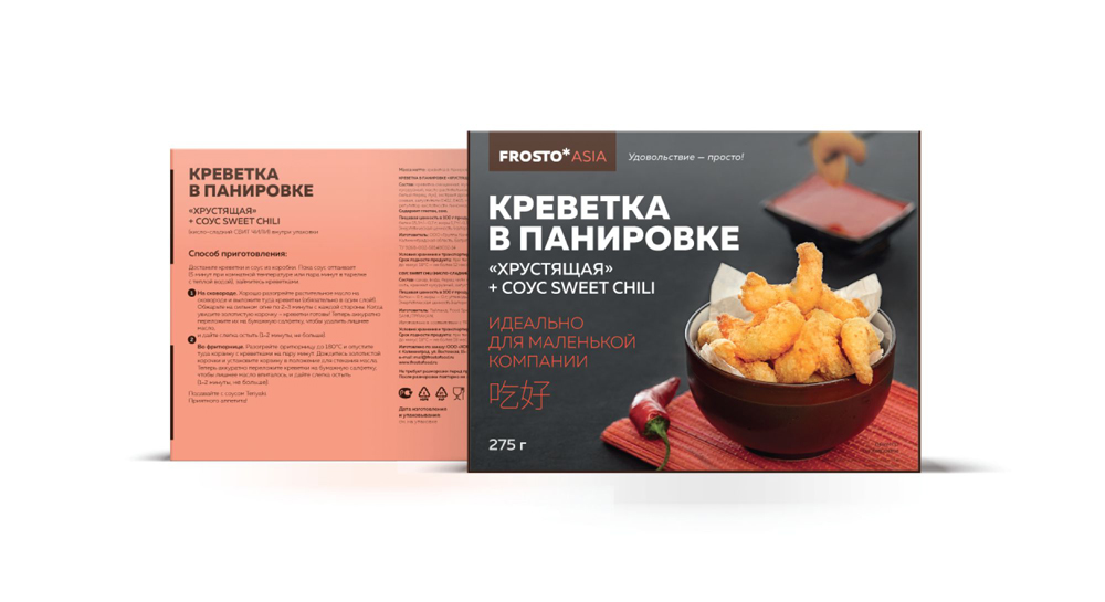 Название FROSTO хорошо вписалось в разработанную дизайнерами платформу, соединяющую качество замороженных продуктов с легкостью приготовления. Бюро разработало линейки, разделив ассортимент на ASIA, EUROPE и ATLANTIC. После дегустаций специалисты бюро привлекли шеф-повара, который придумал рецепты соусов, способы приготовления продуктов. Организовали фотосессию с участием фуд-стилиста, создали изображения для упаковки и презентаций.