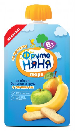 «ФрутоНяня» выпустила фруктовое пюре из яблок, бананов и груш с печеньем в упаковке гуалапак.