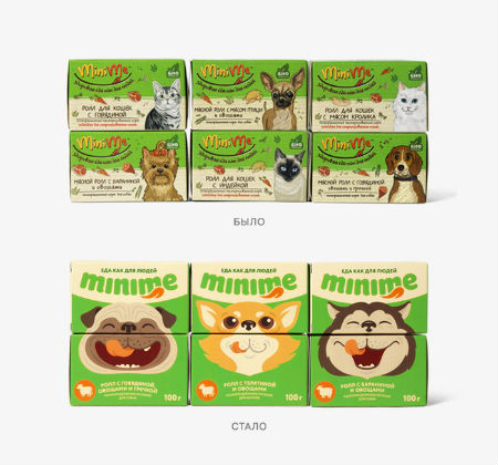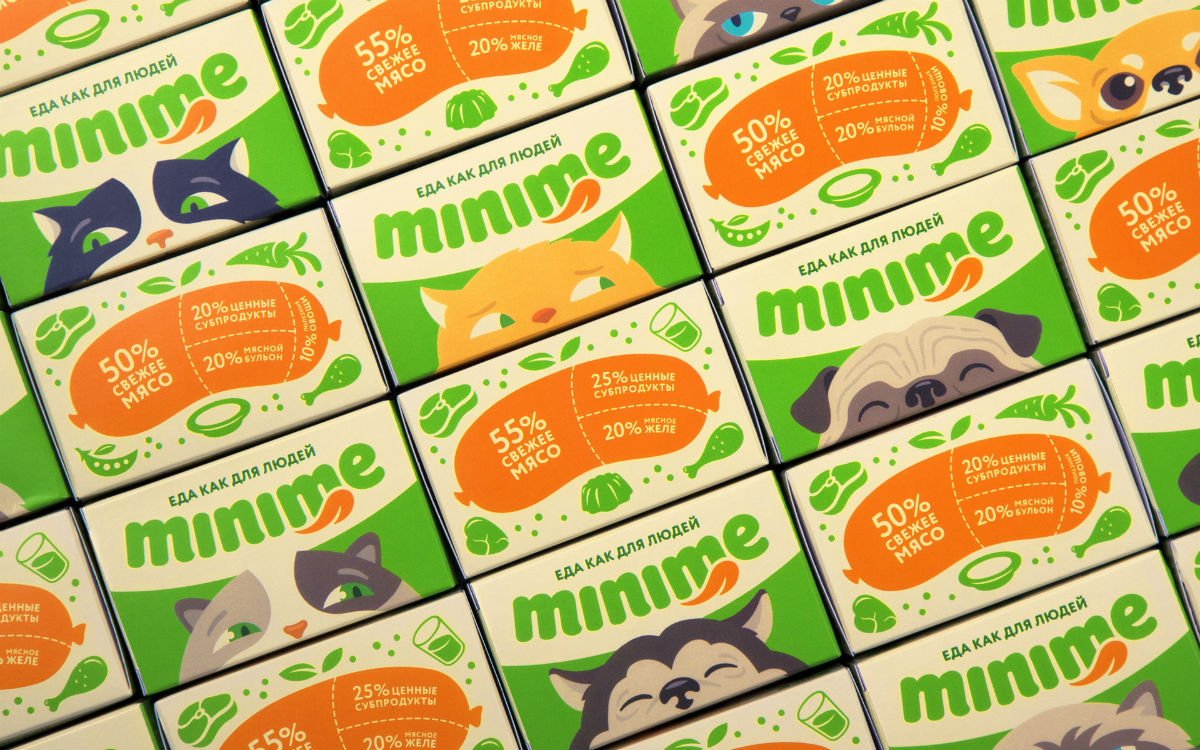 Компания «Миними Петс», пока единственная на российском рынке, производит промышленным способом свежую, без консервантов и ароматизаторов, еду для домашних животных под маркой «Миними». Продукт представлен в собственном интернет-магазине и нескольких розничных сетях. В магазинах товар раскладывается на полках собственного брендированного холодильника. Через год после запуска бренда стало ясно, что для такого уникального продукта требуется более выразительная упаковка.