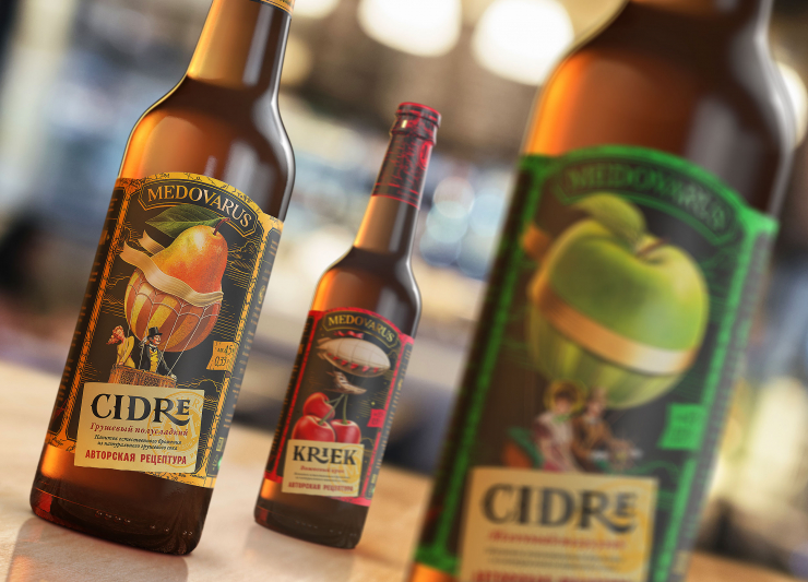 Смысловым решением стала тема путешествий. Воздушный шар, как ее символ, был выбран центральным образом. В тот момент дизайнеры окончательно определились со стилистикой – ретро-футуристический стиль “стимпанк”. Фрукты на этикетке иллюстрируют вкусовые оттенки и несут в себе прямую метафору. Яблоко и груша заменяют верхнюю часть летательного аппарата, но сохраняют идейный замысел. Романтические персонажи 19 века подчеркивают легкость напитка и подразумевают использовании авторских старинных рецептур. Для вишневого “Крика” с легкой горчинкой и более зрелым вкусом визуальным сопровождением стал дирижабль.