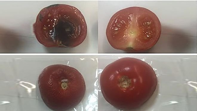 Томаты после 6 дней хранения: слева — в обычной пленке, справа — в пленке из нового материала.