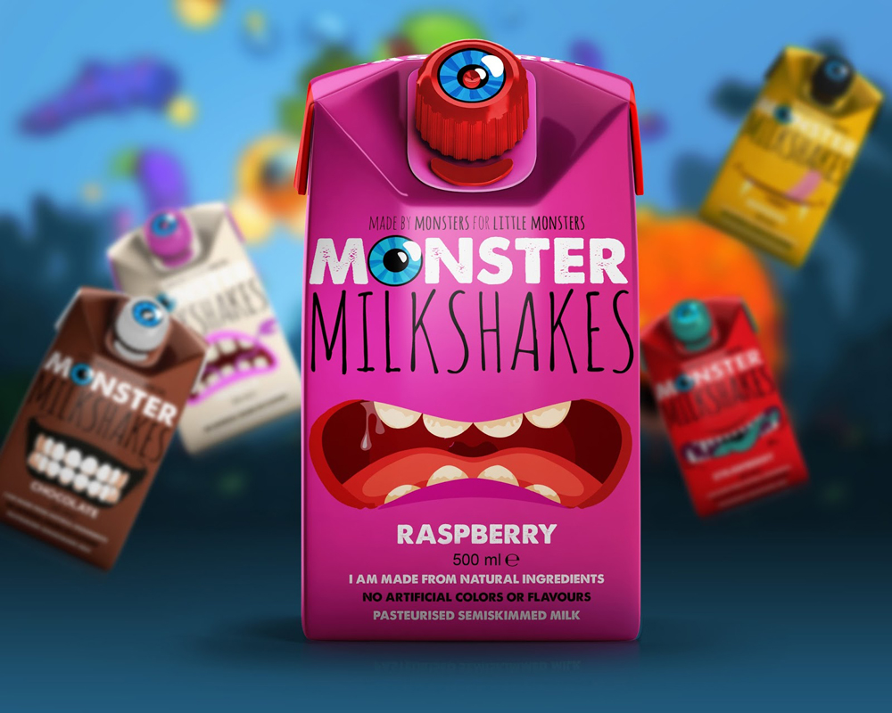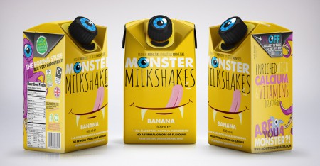 Исходя из названия бренда, дизайнеры студии Epiphany Media (Таиланд) разработали дизайн упаковки молочных коктейлей Monster Milkshakes. В линейку вошли пять вкусов, и все они объединены единым монстроподобным дизайном.