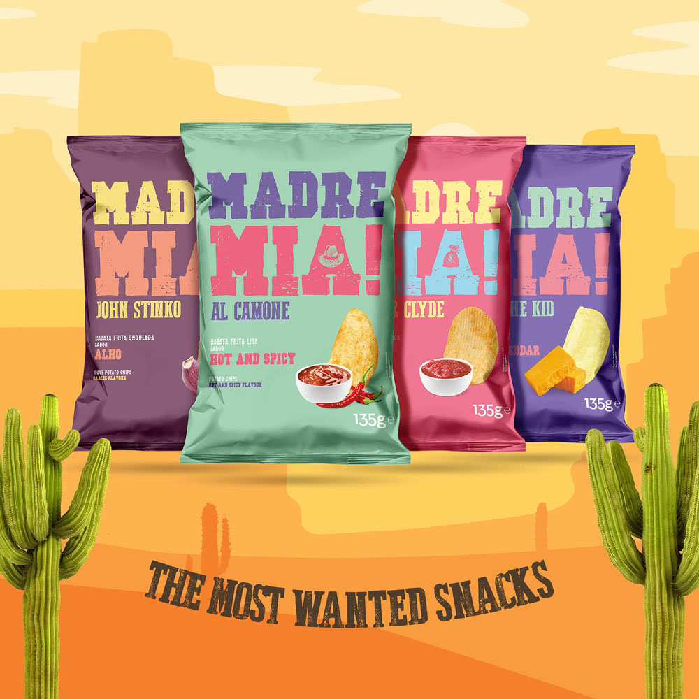Креативное агентство FUEL Lisboa (Португалия) разработало дизайн упаковки нового снекового бренда Madre Mia!. Бренд чипсов выпускается под частной торговой маркой крупной сети гипермаркетов.