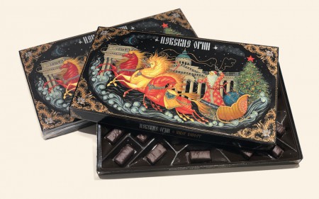 Оформление коробки выполнено в классическом стиле “Палех”. Данный стиль испокон веков используется для росписи шкатулок, в которых хранятся ценные для души вещи. Так и конфеты “Невские огни”, оформленные в таком стиле, превращаются в настоящую шкатулку вкусностей.