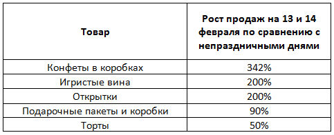 Помимо цветов, заметный рост демонстрирует еще один традиционный символ праздника – наборы конфет в коробках. Динамика в этой категории составляет 342% в сравнении с предшествующими празднику днями. Интересно, что другой «сладкий» атрибут романтического ужина – торты – пользуется значительно меньшей популярностью. Увеличение спроса на этот вид кондитерских изделий составляет только 50%.