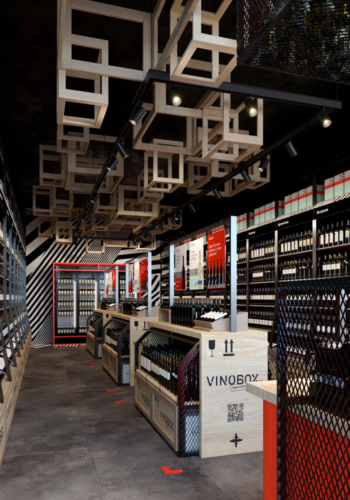 Дизайнеры создали дружелюбное пространство, которое упрощает и облегчает процесс покупки вина, делает его комфортным для всех и создает дополнительные поводы заглянуть вновь. В этом помогают стеллажи чуть выше человеческого роста, эргономичные полки и удобная навигация с цветовым и словесным обозначением по странам, сортам и акциям.