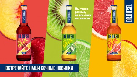 Все три вкуса фруктового пива Dr. Diesel Mix представлены на полках в стеклянной бутылке с ярким дизайном объемом 0,45 л. Крепость напитков составляет 6%.