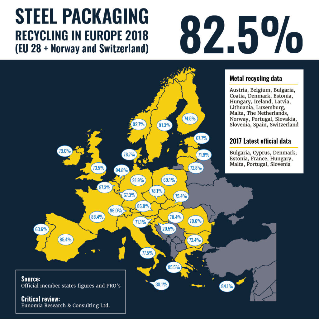 Этот новый рекордный показатель, который представляет данные 2018 года, подтверждает, что сталь является наиболее перерабатываемым первичным упаковочным материалом в Европе и означает, что более 8 из 10 стальных изделий, поставленных на рынок ЕС в 2018 году, были переработаны в новые стальные продукты.