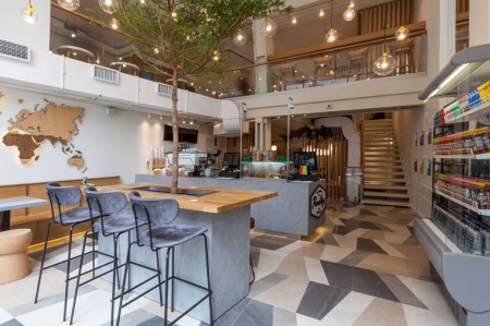 В дизайне кофейни, выдержанном в стиле скандинавского эко-минимализма, широко использованы натуральные материалы: дерево и камень. Внутри кофейни растет большое живое дерево, а у входа планируется установить эко-скамейку, изготовленную из переработанных пачек кофе.