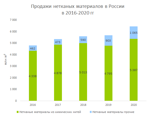 По данным , подготовленного BusinesStat в 2021 г, в 2020 г их продажи нетканых материалов в стране составили 6 452 млн м², что на 34,4% выше уровня 2016 г. Рост был вызван увеличением спроса со стороны потребляющих отраслей и наблюдался на протяжении всего периода с 2016 по 2020 гг.