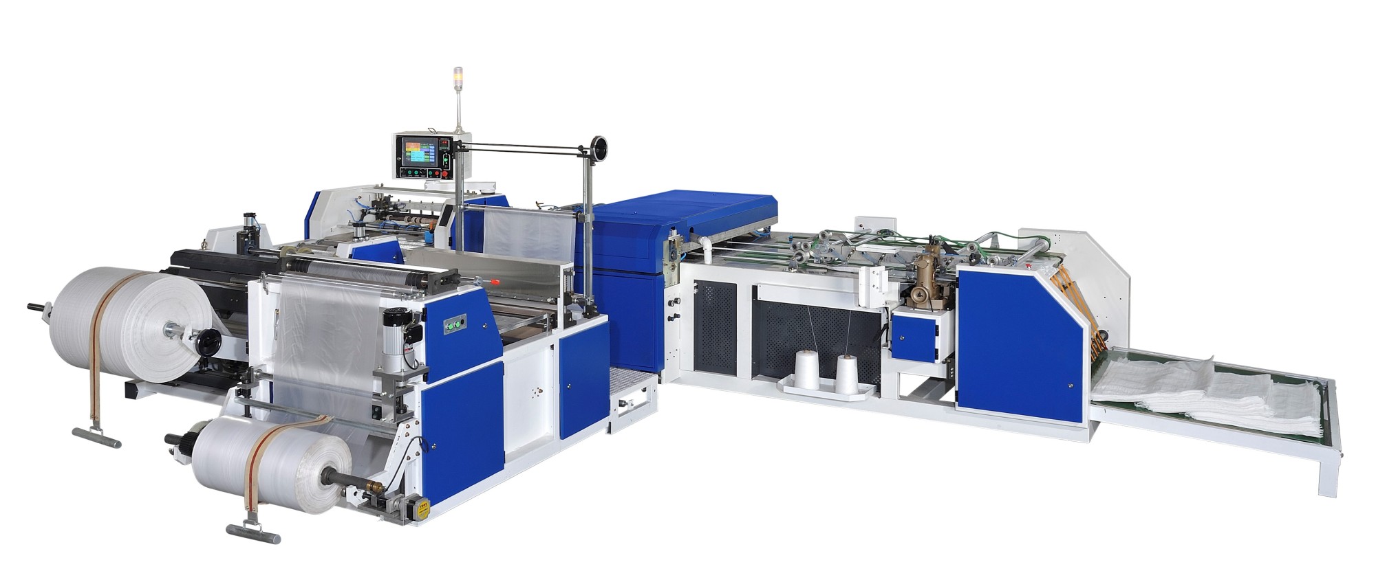 У нее полностью автоматический поточный процесс вставки-резки-шитья. Подкладка полностью сшивается из полипропиленового тканого мешка. Лайнер также не может быть пришит/расстегнут внутри полипропиленового тканого мешка. Без подкладки машина может обрабатывать в обычном режиме раскроя-шитья.