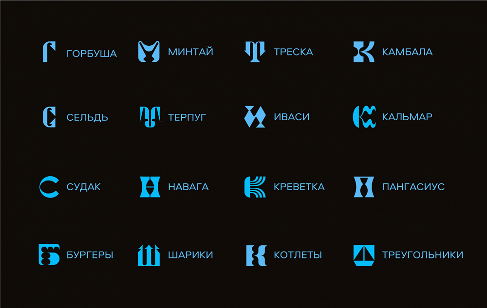 Приём с алфавитом раскрывает смысл самого названия бренда, преобладающий голубой цвет также отсылает к морской тематике. Изображение рыбы разграничивает позиции между собой. Такая дизайн-концепция демонстрирует принципиально новый̆ подход к разработке айдентики бренда: на упаковках различных категорий продукции используются разные версии логотипа, созданные по единому принципу - лаконичное начертание названия сочетается с фоновым символом, который связан с морской тематикой.