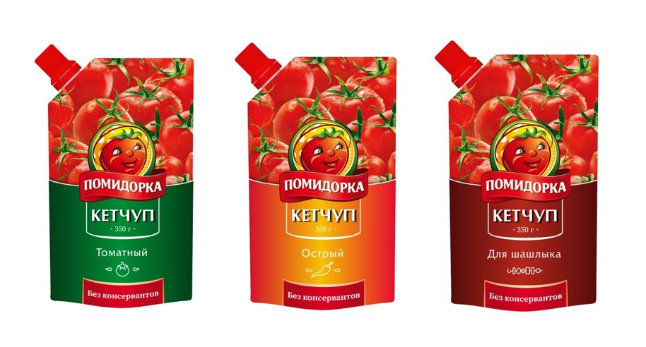 Для каждого из трех видов кетчупа был разработан дизайн упаковки. Разные вкусовые сочетания переданы с помощью цветовых градиентов, за основу же был взят узнаваемый дизайн упаковок другой продукции «Помидорки».