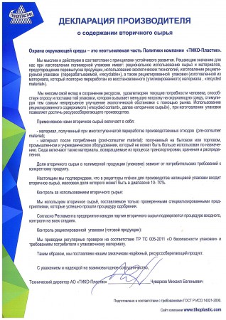 Использование вторичного сырья в компании четко регламентируется. В компании действует Декларация о содержании вторичного сырья. В ней заявлены основные принципы применения вторичного сырья в непищевой упаковке.