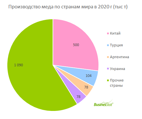 Ведущим производителем меда в мире среди стран является Китай, объем производства которого в 2020 г составил 500 тыс т, а доля в совокупном объеме производства– 27,0%. На втором месте находится Турция с объемом производства 104,1 тыс т и долей 5,6%. Замыкают тройку лидеров Аргентина и Украина, доля каждой из стран в совокупном производстве меда в мире составила 4,2% (78 тыс т). Стоит отметить, что в 2016-2019 гг Украина находилась на четвертом месте в общемировом рейтинге производителей меда и только 2020 г догнала по производству Аргентину и разделила с ней третью строчку рейтинга.